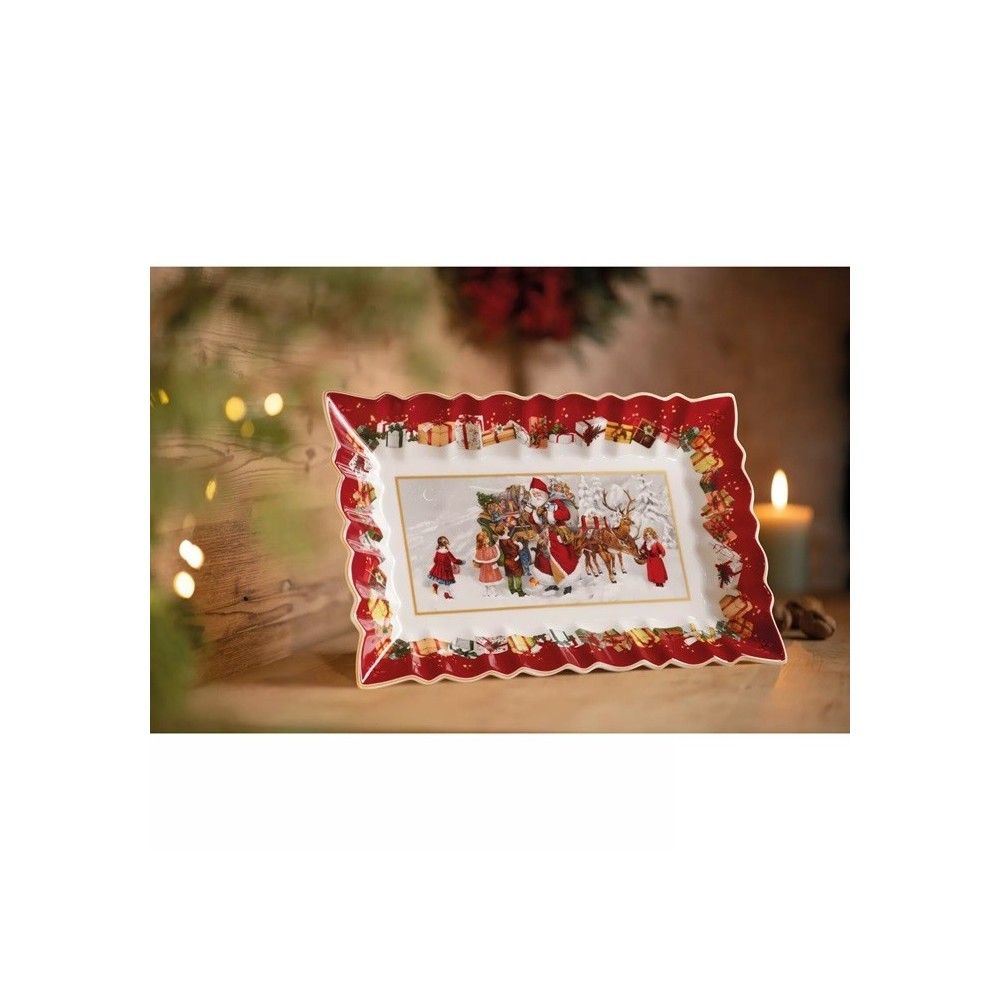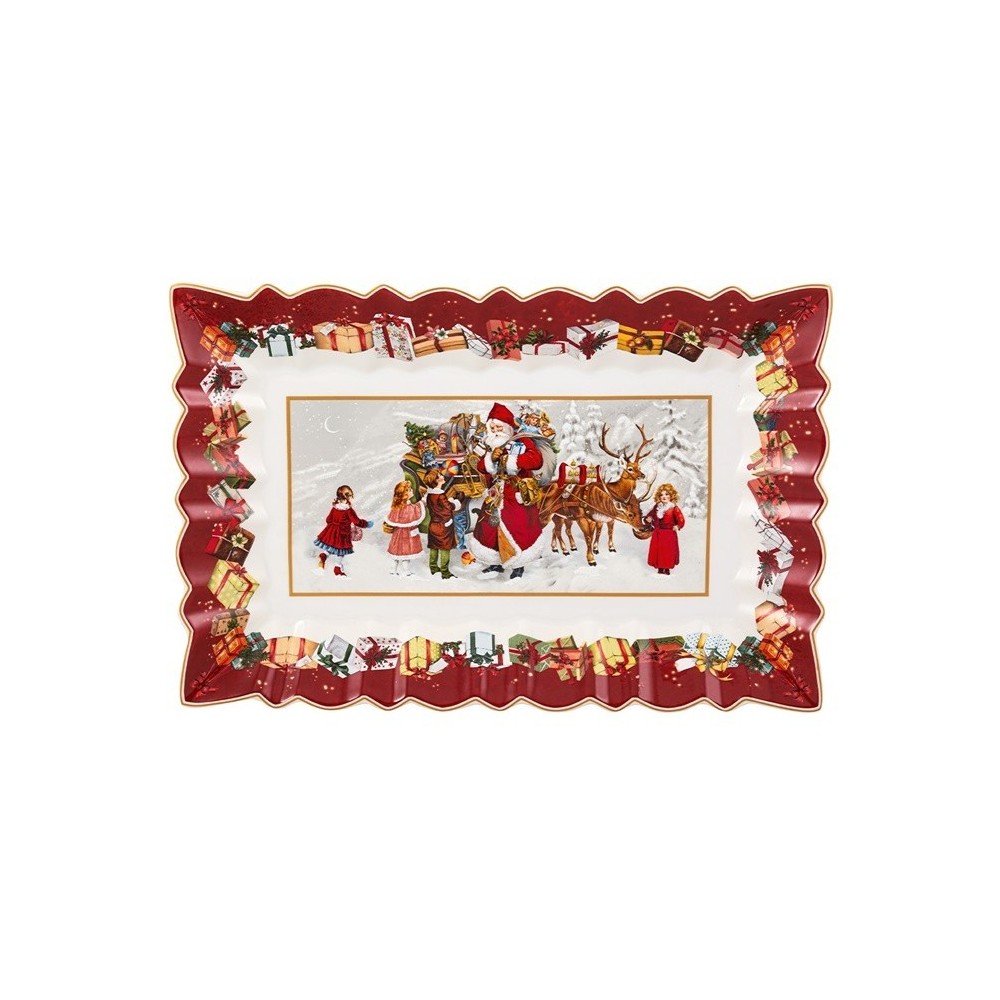 Piatto da portata rettangolare Villeroy & Boch collezione Toy's Fantasy in porcellana decorato con il disegno di Babbo Natale e bambini sulla slitta. Ideale per servire dolci natalizi, torte e biscotti.