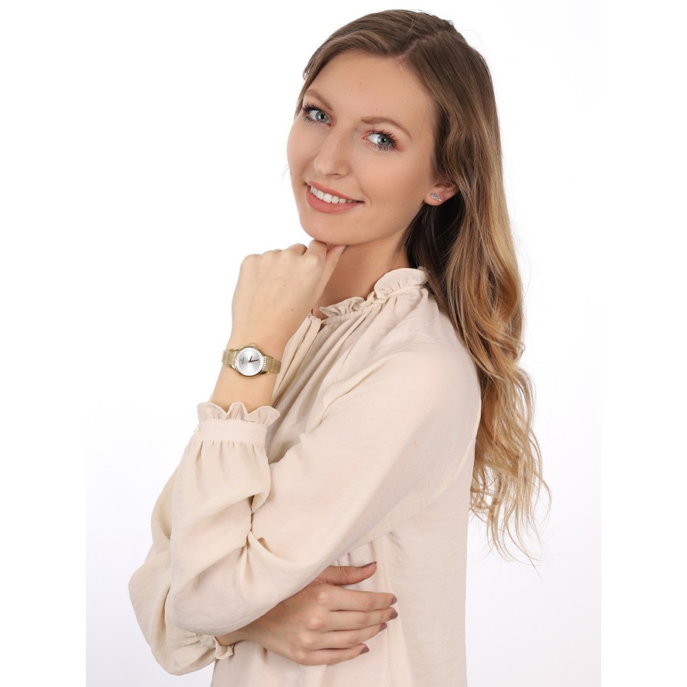 Orologio Festina da donna con movimento al quarzo e funzioni di solo tempo.Cassa in acciaio inox con finitura dorata dal diametro di 30,2 mm impreziosita da cristalli bianchi. Quadrante sunray silver con lancette gold.Cinturino in maglia milano d'acciaio anallergico; chiusura deployante con pulsanti. Resistente all'acqua fino a 50 metri di profondità.