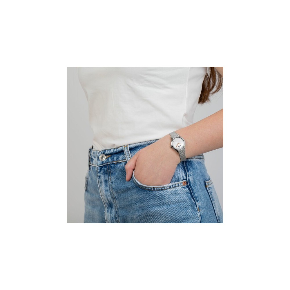 Orologio Festina Madamoiselle 30mm da donna in Acciaio Inossidabile 316l, spessore della cassa 7,45mm, vetro minerale, colore del quadrante bianco con zirconi e lancette in oro rosa, con movimento al quarzo, impermiabile fino a 5 bar (50metri), cinturino in acciaio maglia milanese con chiusura da pressione