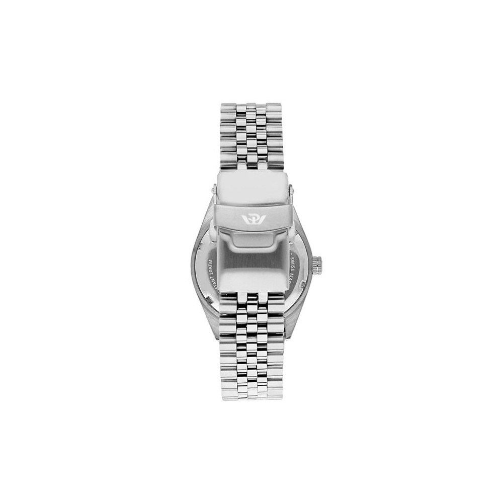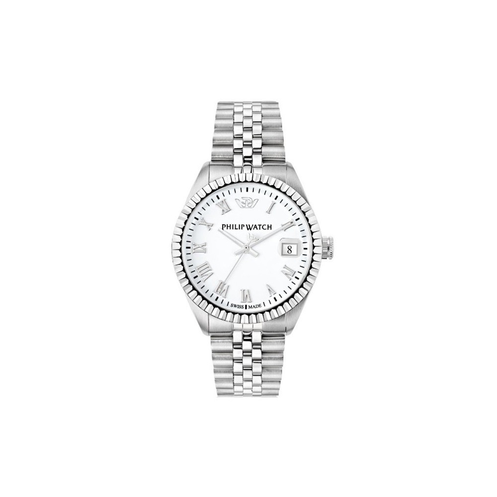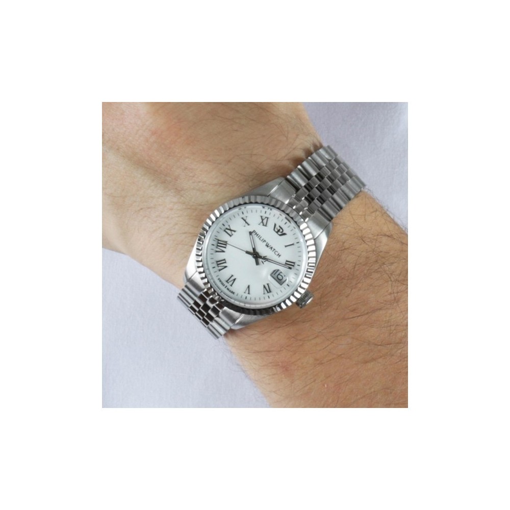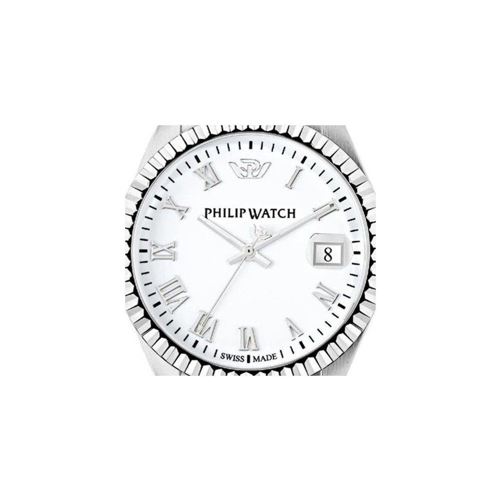 Orologio a uomo Philip Watch solo tempo collezione Caribe. Cassa rotonda in acciaio inossidabile del diametro di 39mm e spessore di 9,35mm. Movimento al quarzo. Vetro zaffiro. Quadrante anaologico bianco con nuneri romani e lancette argentate e visualizzazione della data a ore 3. Cinturino in acciaio inossidabile con chiusura a fibbia deployante. Impermeabile fino a 10bar(100m). Garanzia Philip Watch valida 2 anni.