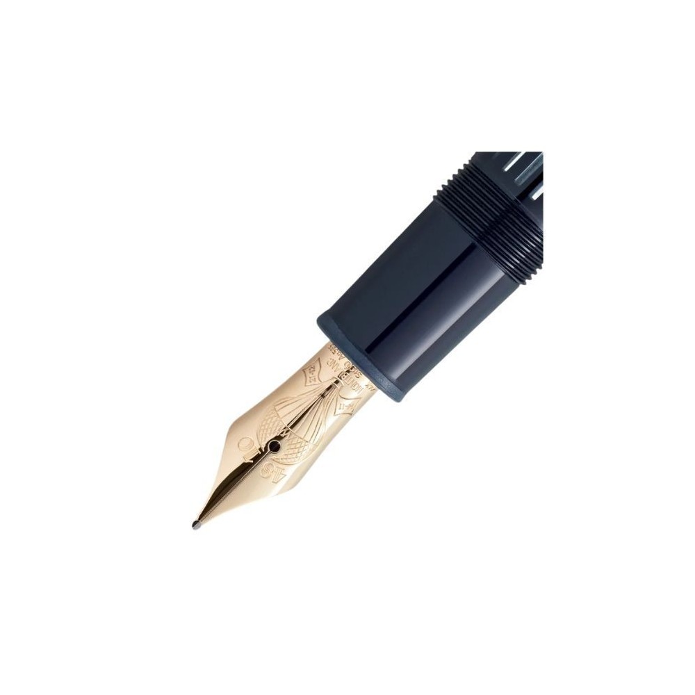La collezione Meisterstück Around the World in 80 Days si ispira al famoso romanzo di avventura di Jules Verne “Il giro del mondo in 80 giorni”. La stilografica LeGrand, decorata con pregiata resina blu scura, racconta l’epico viaggio del Signor Fogg e di Passepartout.Contempla gli elaborati dettagli: un treno elegantemente inciso al laser sul cappuccio, un motivo catena di sicurezza sul cono, che riproduce un movimento rotante quando Passepartout stacca il treno dalla locomotiva per salvare l’equipaggio attaccato dai Sioux. Il design del cappuccio immortala le valvole della pressione e il fumo della locomotiva, mentre la clip sfoggia l’asso di cuori laccato rosso, simbolo dell’unione di Phileas Fogg e la principessa Auda. Inoltre i semi delle carte rappresentano l’ardita scommessa di Fogg di concludere il viaggio in soli 80 giorni. La parte superiore del cappuccio reca goffrata la cronologia del viaggio: 36 giorni da Yokohoma a Londra, che culminano nel totale di 80 giorni in giro per il mondo. A esaltare questo strumento da scrittura, un pennino realizzato a mano in oro 14 K con inciso 14/11, tributo alla data della partenza di Fogg da Yokohama, e 21/12, data di rientro al club londinese per vincere la scommessa secondo il suo ambizioso piano. È inoltre decorata con la rappresentazione di una mongolfiera, rimando al primo romanzo di avventura di Jules Verne.Ident No. MB132875