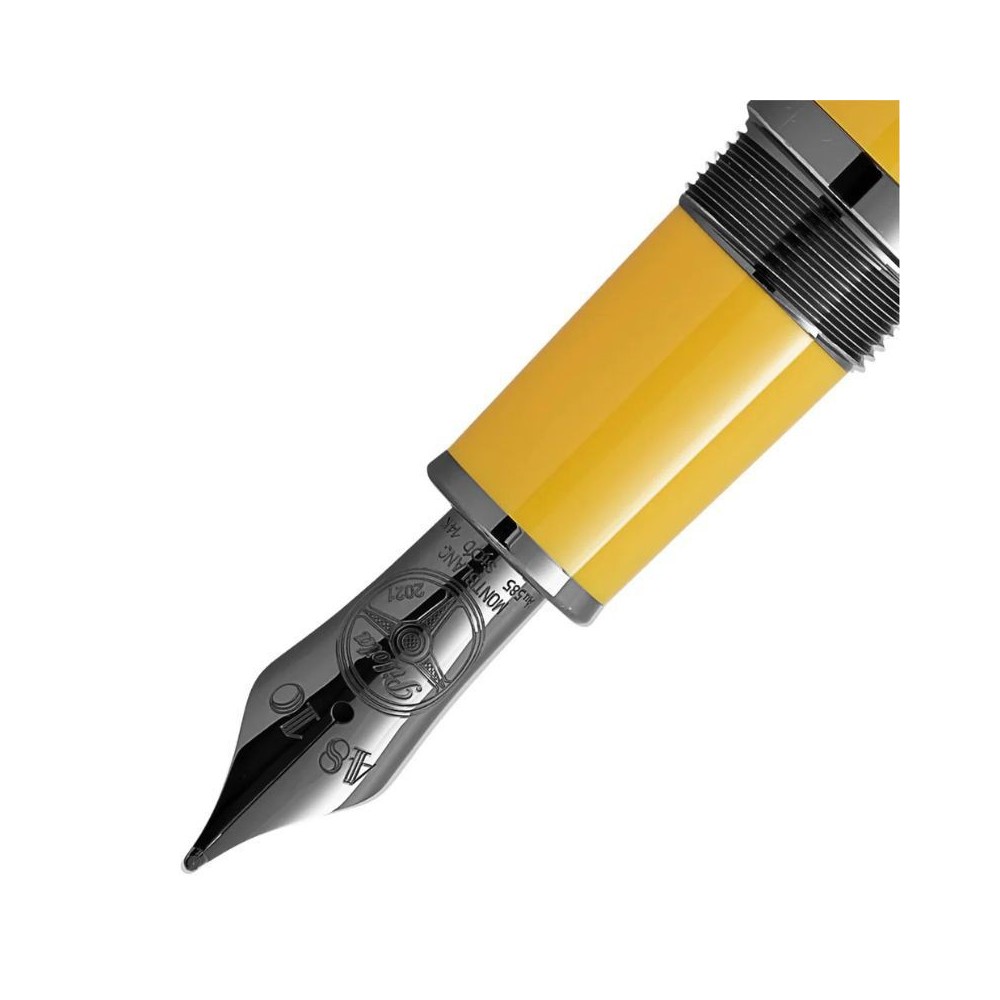 Penna stilografica della collezione Montblanc Great Characters Enzo Ferrari Special Edition. Colore: giallo e grigio.L’accessorio di scrittura, in pregiata resina gialla, celebra la visione pionieristica di Enzo Ferrari e la sua passione per le corse. La penna sfoggia elaborati dettagli: sul cappuccio è inciso il Cavallino Rampante, accompagnato dalle parole della contessa Paolina Biancoli “Le porterà fortuna”, simbolo dell’eredità lasciata a Enzo Ferrari. Il cono reca incise le date del suo compleanno e della sua prima vittoria, mentre la parte superiore del cappuccio è decorata con la firma di Ferrari e il nome dell’officina del padre, “Officina Meccanica Alfredo Ferrari”. Il design rende omaggio alla prima automobile prodotta dalla Ferrari, la 125 S, con dodici linee incise che rappresentano i suoi dodici cilindri, mentre l’intricata lavorazione in metallo richiama la griglia di una vettura d’epoca. La clip è impreziosita dal motto di Enzo Ferrari “You cannot describe passion, you can only live it”, mentre il pennino in oro massiccio Au 585 finitura rutenio è goffrato con la parola “Pilota” e il volante della 250 GTO, una delle sue auto da corsa più celebri. L’emblema Montblanc in resina blu, tributo allo stemma di Modena, completa l’insieme. Dimensioni: 147,5 x 117,5 mm. Peso: 52,84 gr.