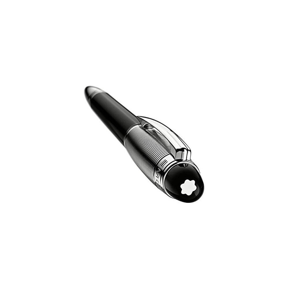 Penna stilografica Montblanc collezione Starwalker Douè , realizzata in resina nera con motivo guillochè, pennino in oro 14 K, pennino in oro Au585 / 14 K lavorato a mano con inserto rodiato, penna stilografica a cartuccia, barile placcato platino con motivo guilloché orizzontale, clip placcata platino altamente lucida con scritta Montblanc in rilievo e numero di serie individuale.