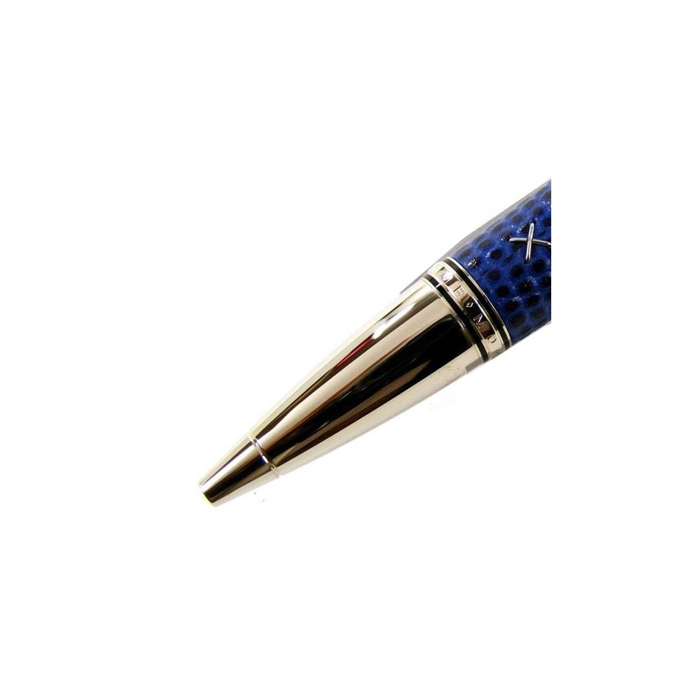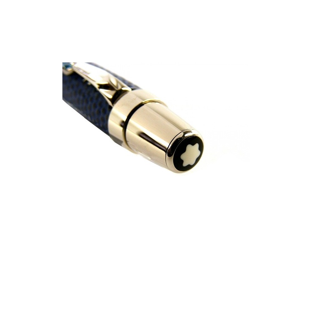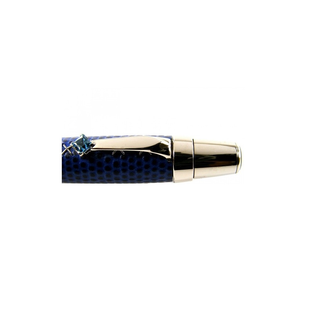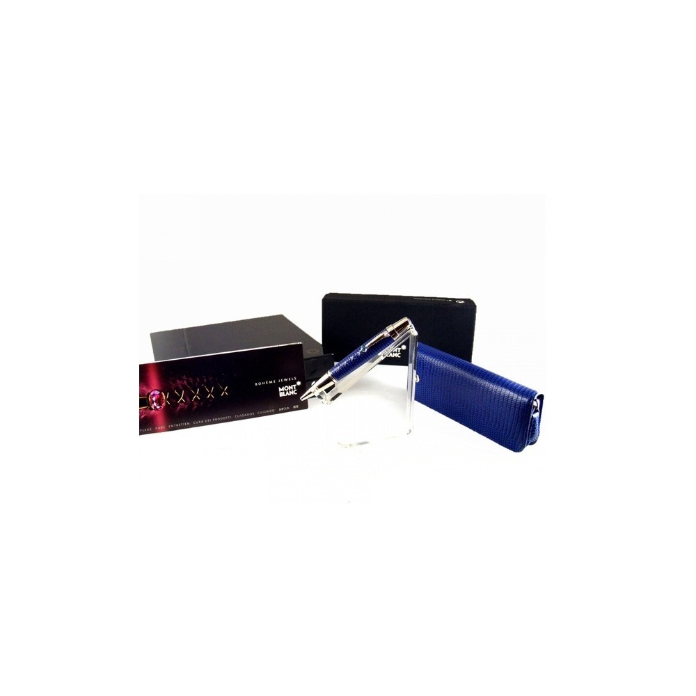 Penna a sfera Montblanc collezione Boheme Jewels i . Descrizione Penna stilografica 09931: penna stilografica a cartuccia, pennino retrattile in oro 18 K placcato platino, fusto con pelle di vitello blu, cappuccio placcato platino con emblema Montblanc intarsiato, anelli platino e clip con pietra preziosa topazio blu taglio quadrato Sistema di scrittura: Penna stilografica a cartuccia (senza converter) Pennino: pennino in oro 18 K rodiato lavorato a mano Bariletto: pelle di vitello blu con cuciture in metallo placcato platino Cappuccio: placcato platino e intarsiato con emblema Montblanc Finiture: tre anelli platino con impresso Montblanc Clip di marca: Clip placcata in platino con una vera gemma di topazio blu a taglio quadrato.