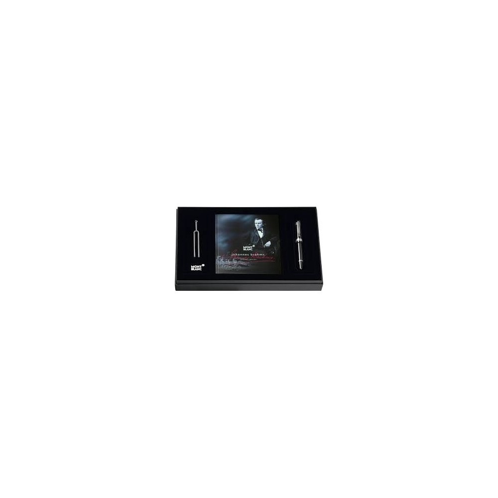Penna roller Montblanc collezione Johannes Brahms. Omaggio a uno dei più grandi musicisti del periodo romantico, il compositore e pianista tedesco Johannes Brahms. Cappuccio e corpo in pregiata resina nera con finiture platino completate da un design ispirato all 'affascinante mondo della musica classica, al quale Brahms dedicò tutta la vita. Riproduzione della firma di Brahms incisa sull 'anello del cappuccio.